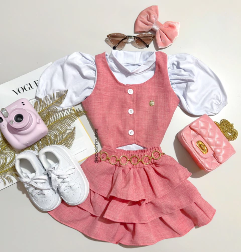 Composto por saia, blusa e colete. Envio em até 3 dias úteis após a confirmação. Compras feitas em boleto tem prazo de 24h para pagamento, caso o pagamento não seja efetuado nesse prazo, a compra será cancelada automaticamente. Para confirmação dentro desse prazo, mande o recibo do pagamento do boleto para WhatsApp da loja (77) 99940-7020.