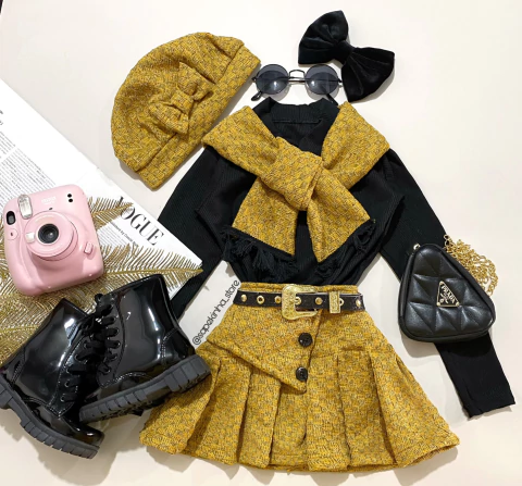 Composto por cachecol, boina, blusa e short saia. Envio em até 3 dias úteis após a confirmação. Compras feitas em boleto tem prazo de 24h para pagamento, caso o pagamento não seja efetuado nesse prazo, a compra será cancelada automaticamente. Para confirmação dentro desse prazo, mande o recibo do pagamento do boleto para WhatsApp da loja (77) 99940-7020.