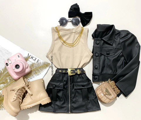 - > Conjunto jaqueta e saia cargo courino
