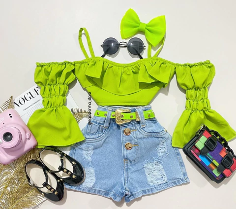 - > Conjunto jeans bordado tropical