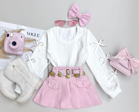 Composto por short saia com cinto do mesmo tecido e blusa.